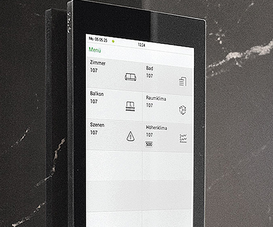 Die Gäste können in ihren Zimmern über das Multitouch-Display u. a. die Beleuchtung, die Vorhänge, das Insektenschutzrollo des Balkons und die Raumtemperatur bedienen sowie den vom Arzt verordneten und eingestellten Wert des Höhenklimas ablesen. Die Tastsensoren in den Räumen sind mit Symbolen gelasert – eine Bedienphilosophie, von der nicht nur internationale Gäste profitieren (Bild 7). Das Designkonzept setzt auf hochwertige, langlebige Materialien.