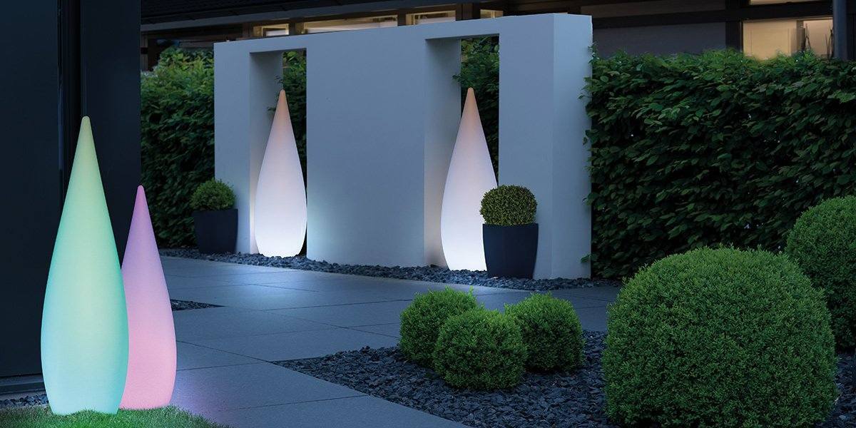 Ein echtes Highlight im repräsentativen Außenbereich stellen die Objektleuchten der RZB Home Serie dar. Schwimmfähige Kugeln sowie Leuchten in Zypressen- oder Zylinderform sind mit integrierter Batterie und RGB Farbwechsel ausgestattet. Dadurch sind sie sehr variabel einsetzbar und verleihen jedem Balkon bzw. Garten ein stimmungsvolles Ambiente.